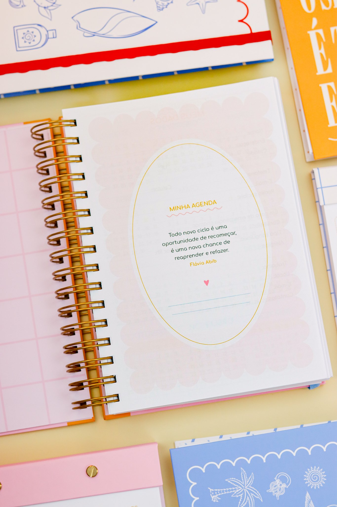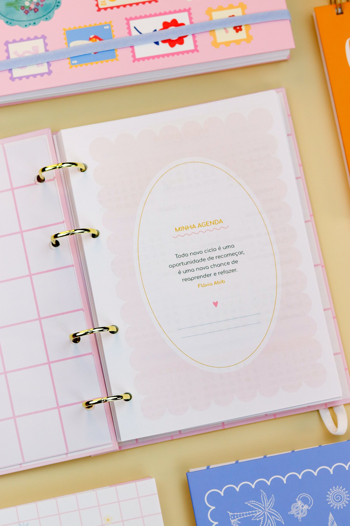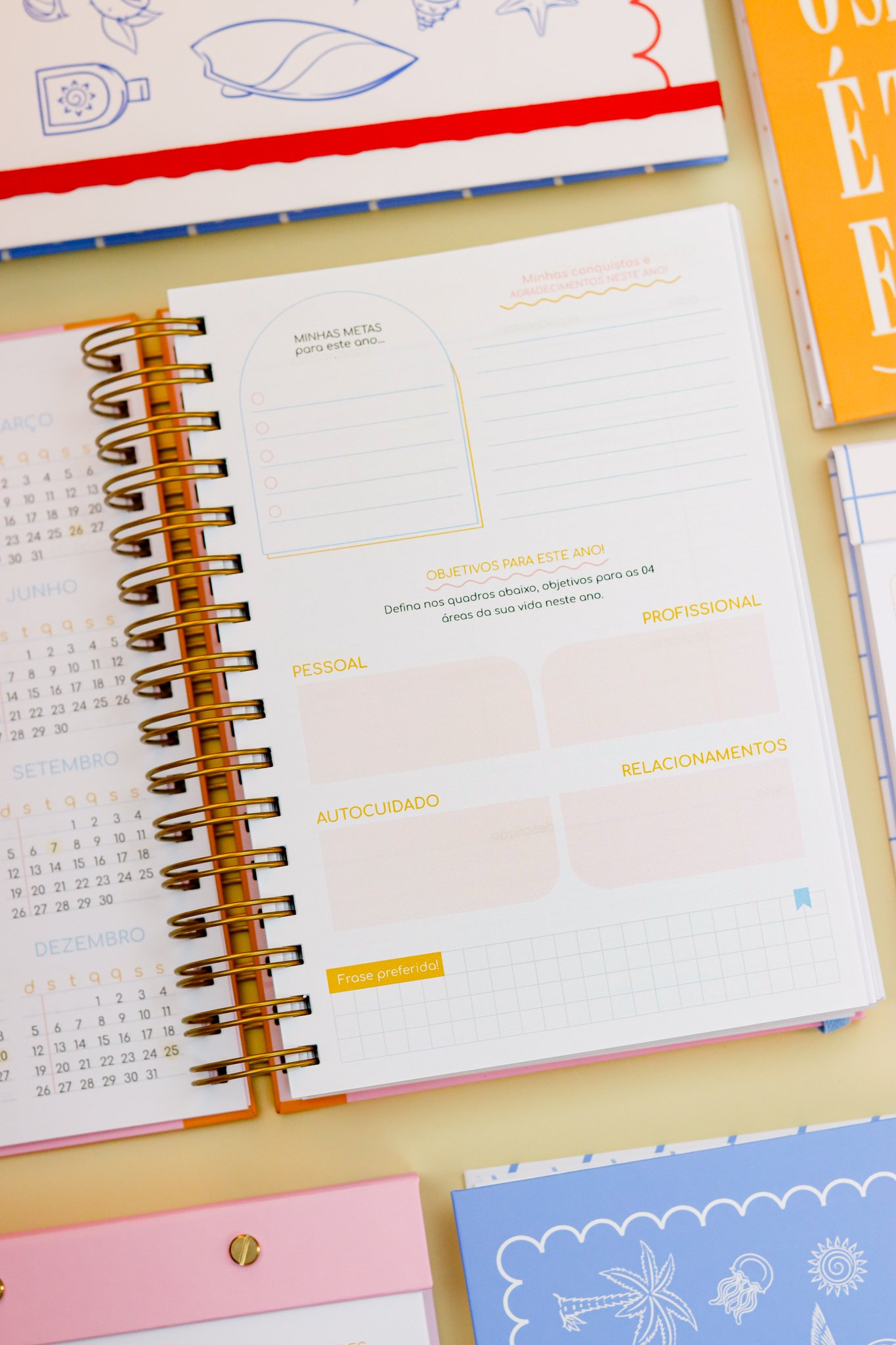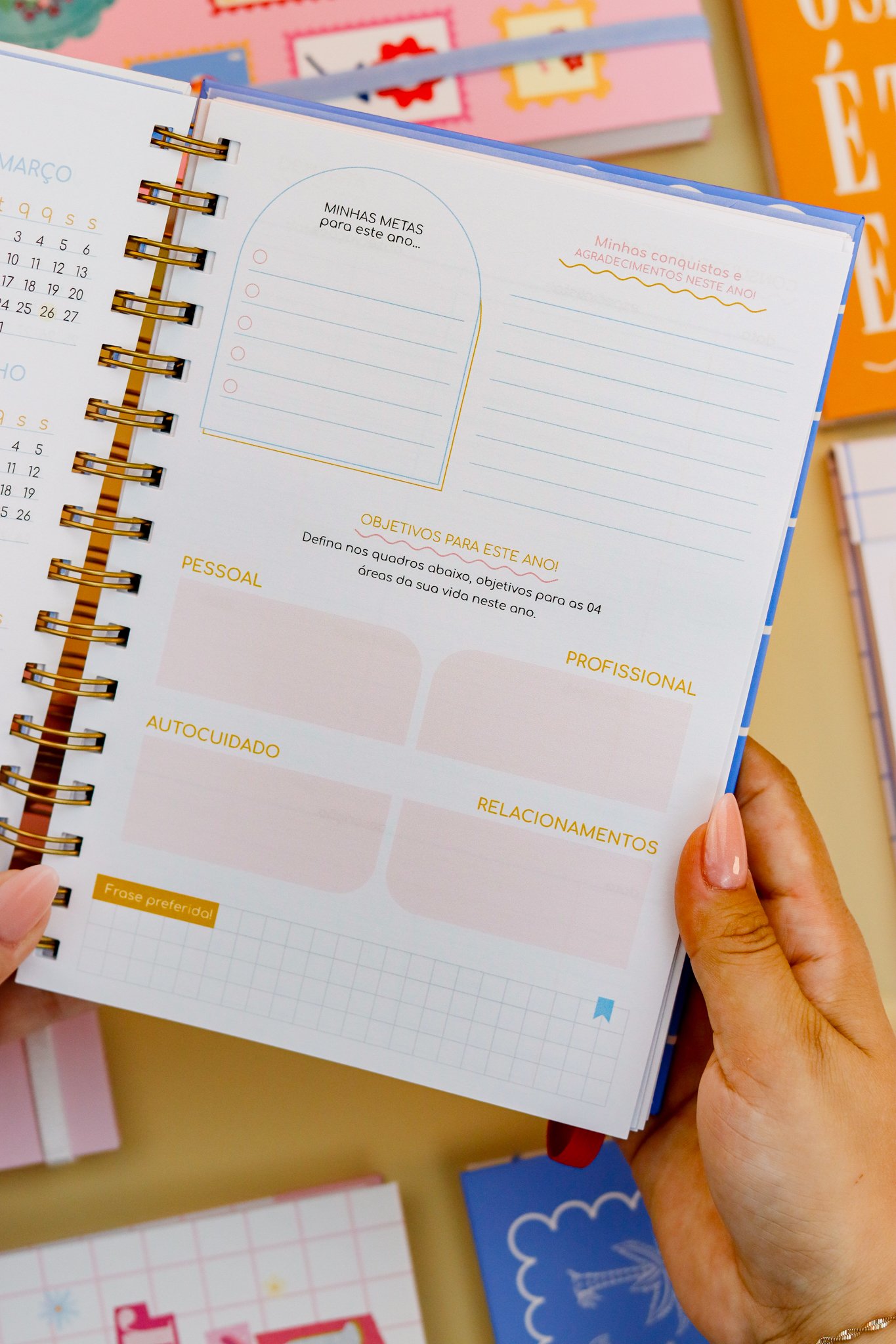 Contéudo das Agendas: Pág de início com frase, pág de dados, calendários 2026/2027 e um insert com 2027/2028, metas para o ano, planejamento do ano de janeiro a dezembro, consultas médicas, planejameno financeiro de janeiro a dezembro, página visão mensal sem datas a cada mês e no verso o resumo do mês.