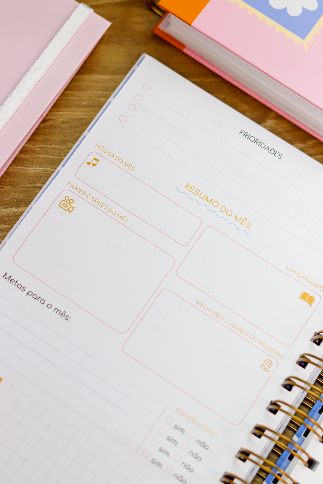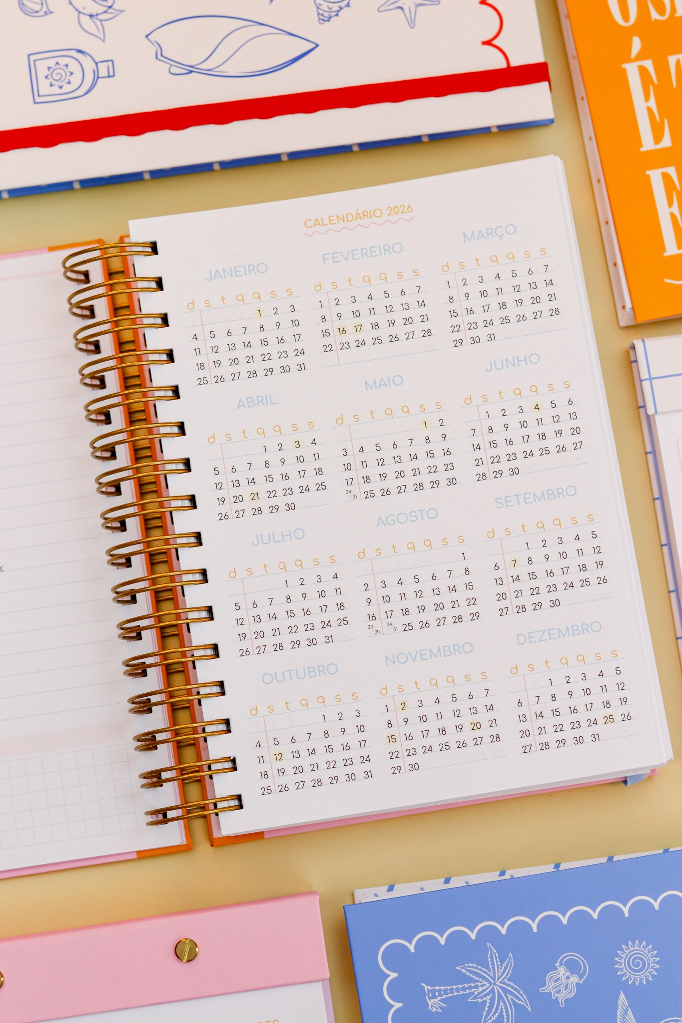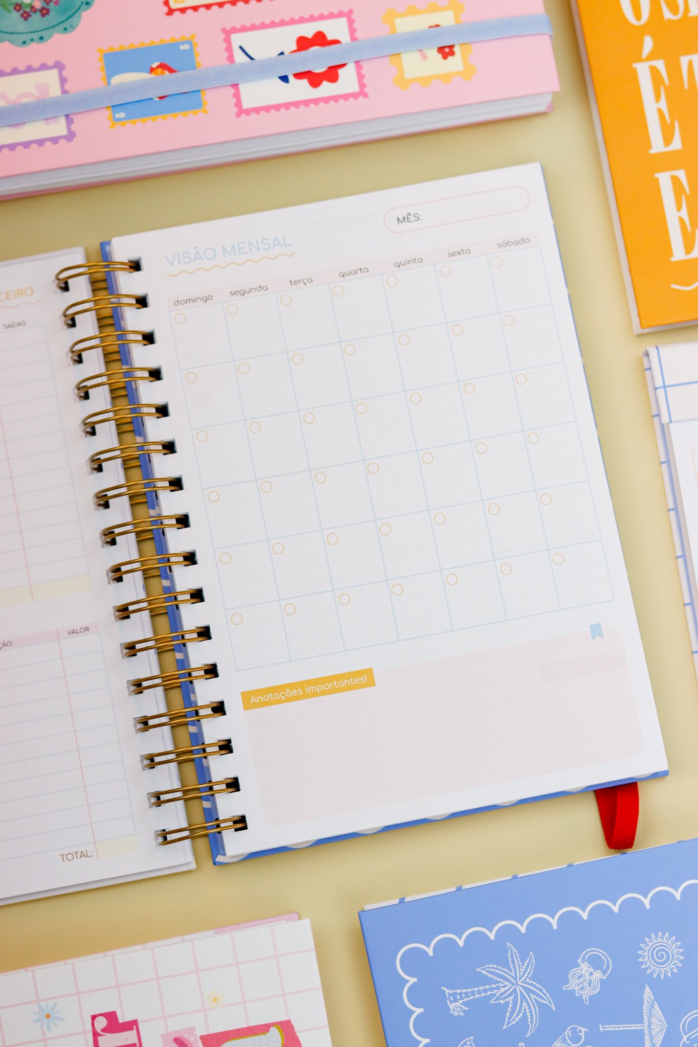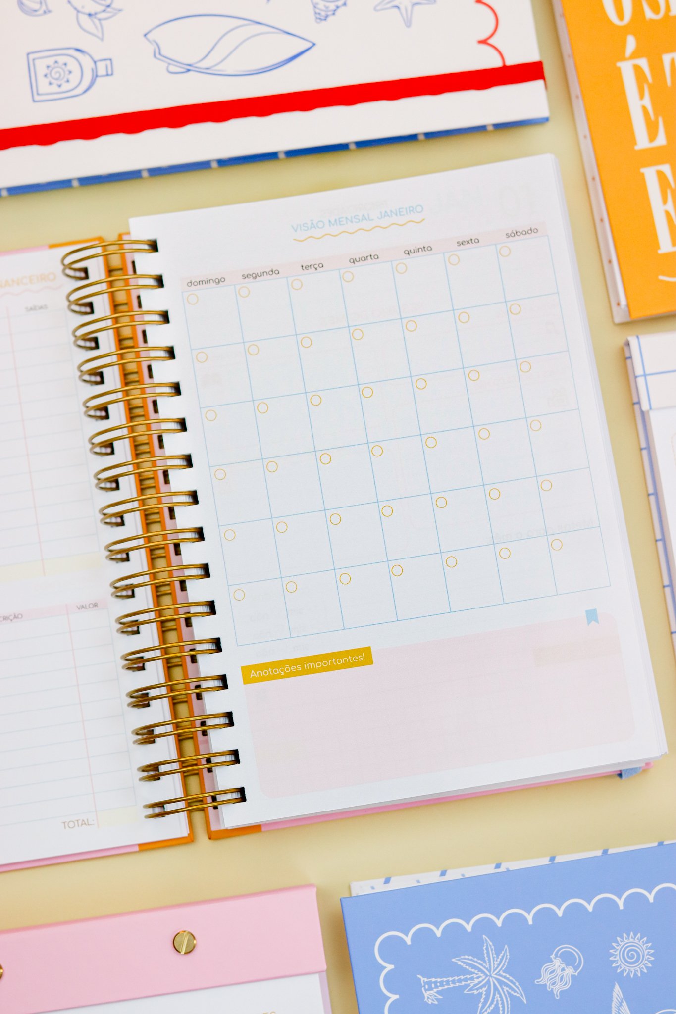 Contéudo das Agendas: Pág de início com frase, pág de dados, calendários 2026/2027 e um insert com 2027/2028, metas para o ano, planejamento do ano de janeiro a dezembro, consultas médicas, planejameno financeiro de janeiro a dezembro, página visão mensal sem datas a cada mês e no verso o resumo do mês.