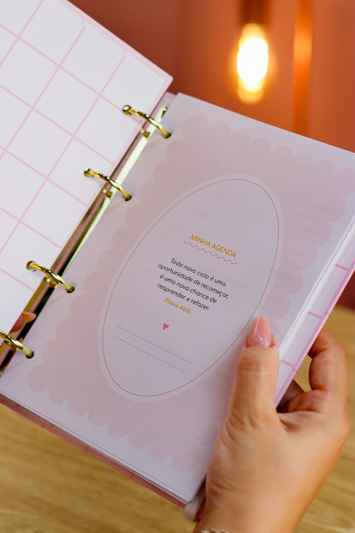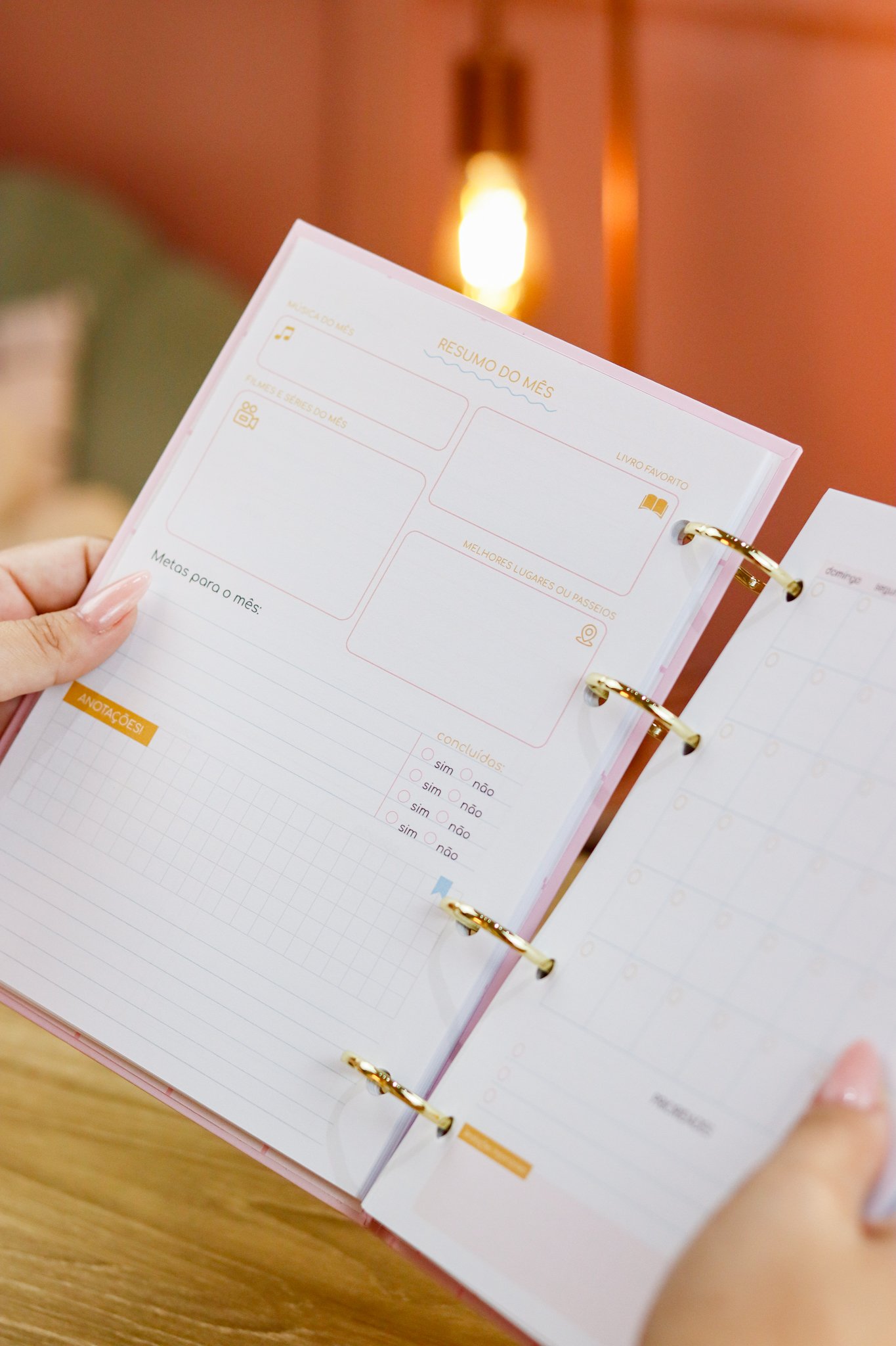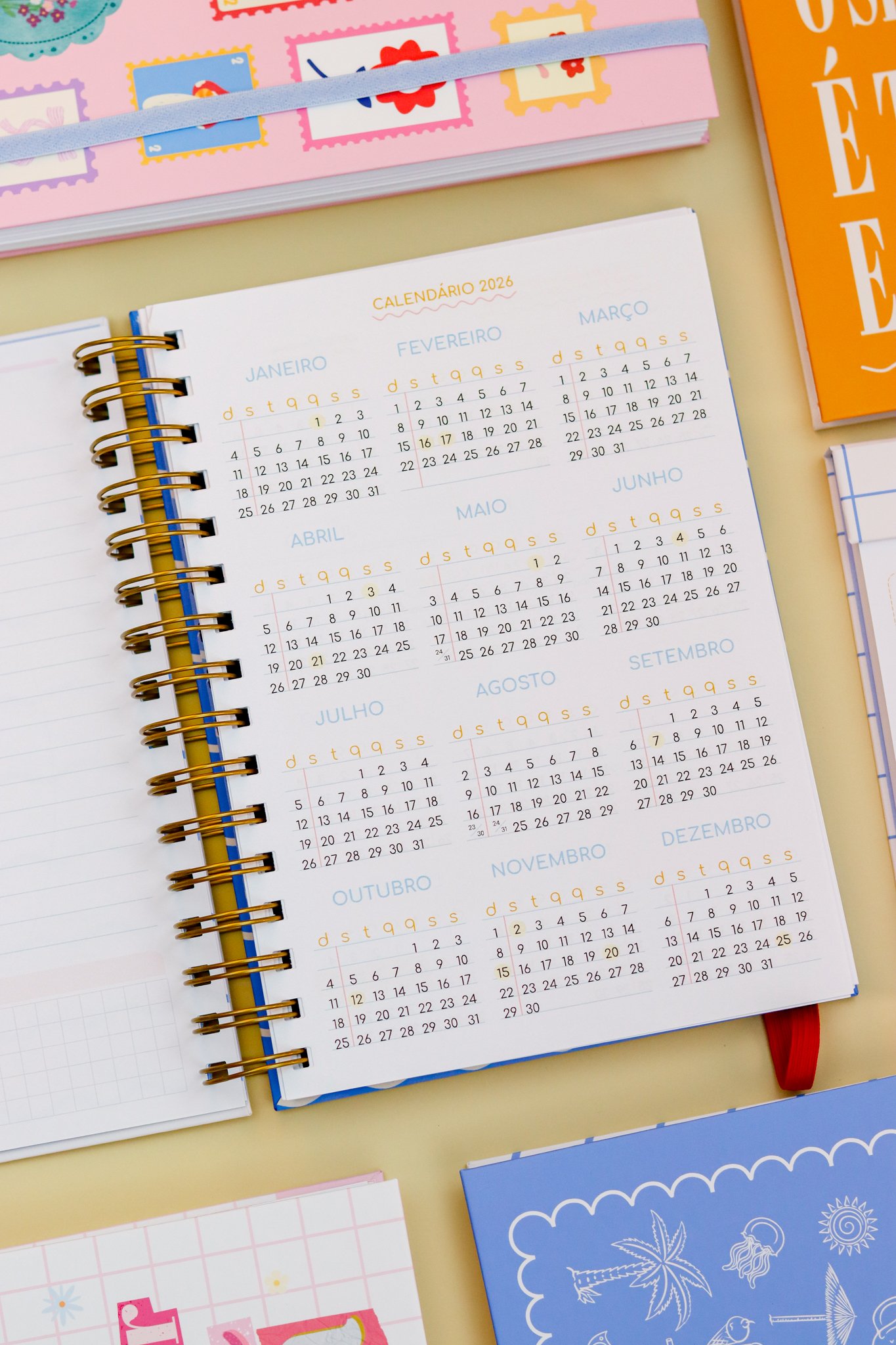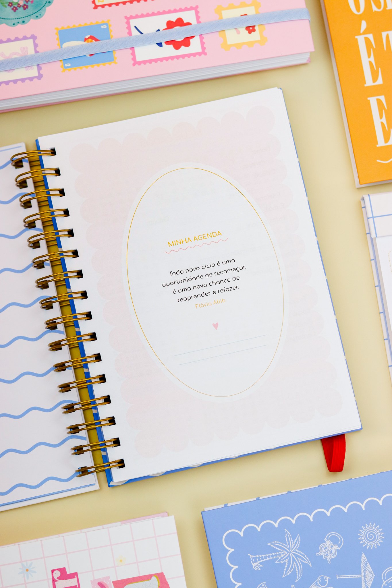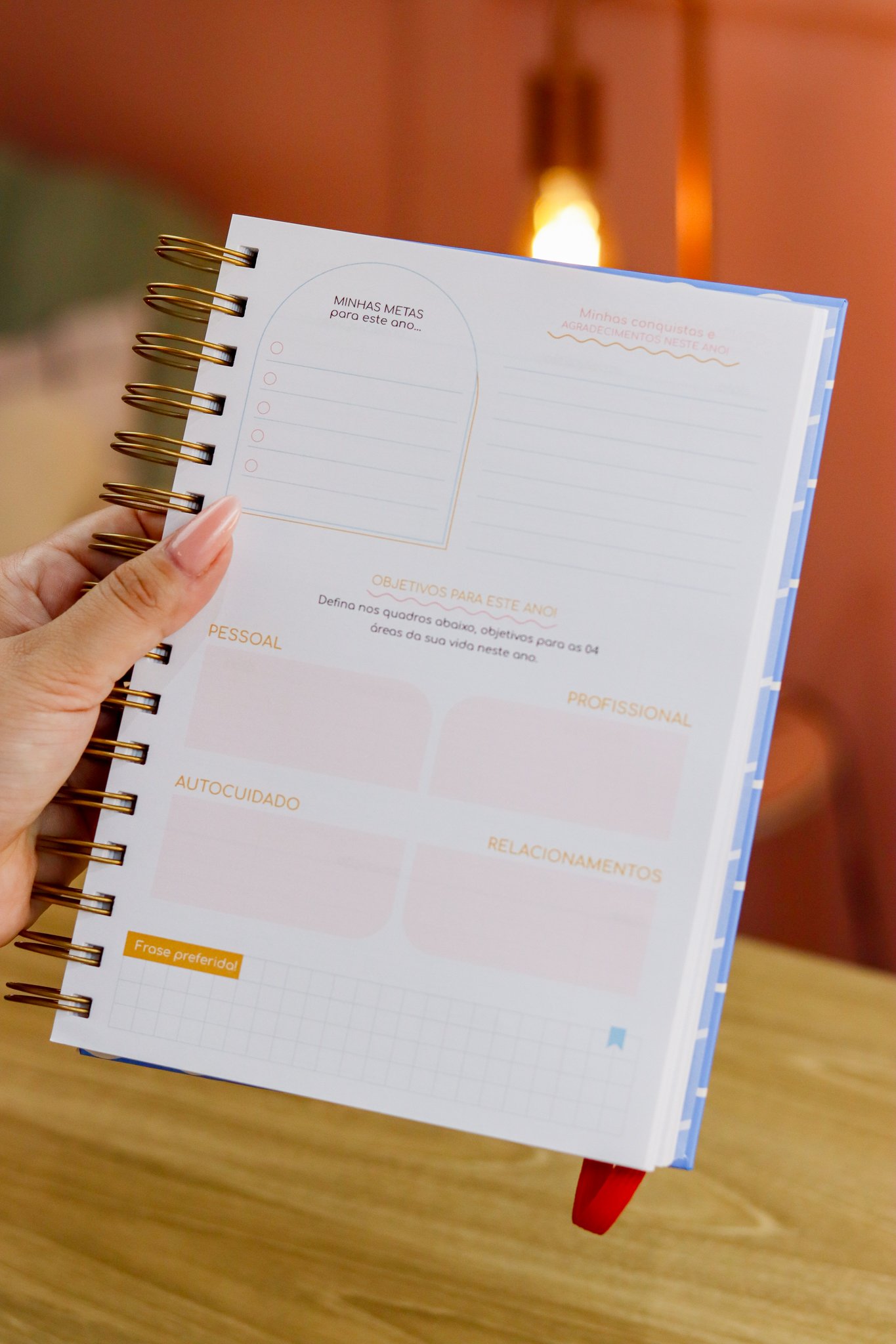 Contéudo das Agendas: Pág de início com frase, pág de dados, calendários 2026/2027 e um insert com 2027/2028, metas para o ano, planejamento do ano de janeiro a dezembro, consultas médicas, planejameno financeiro de janeiro a dezembro, página visão mensal sem datas a cada mês e no verso o resumo do mês.