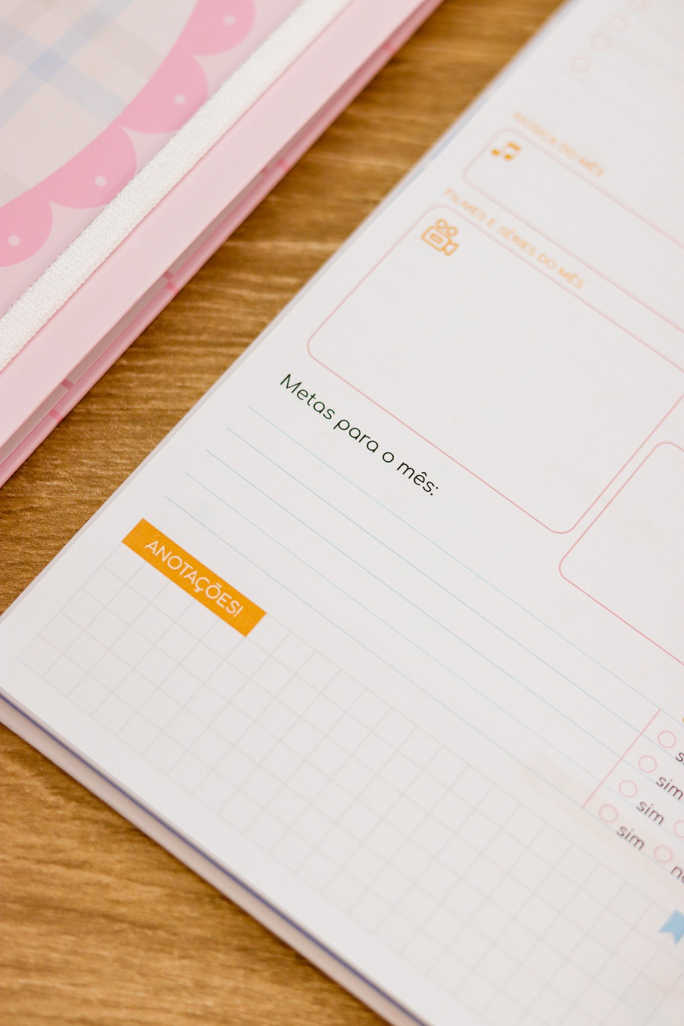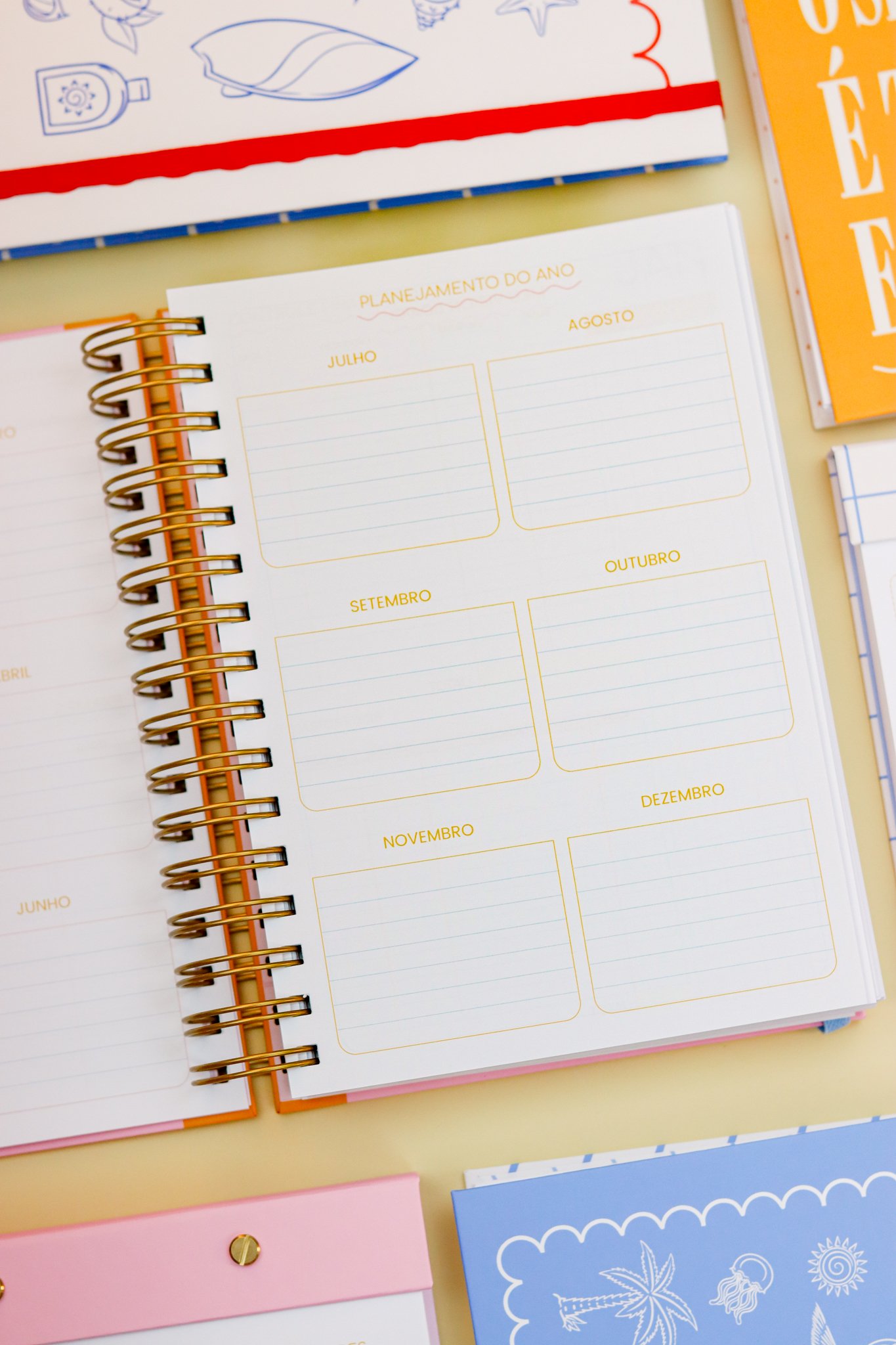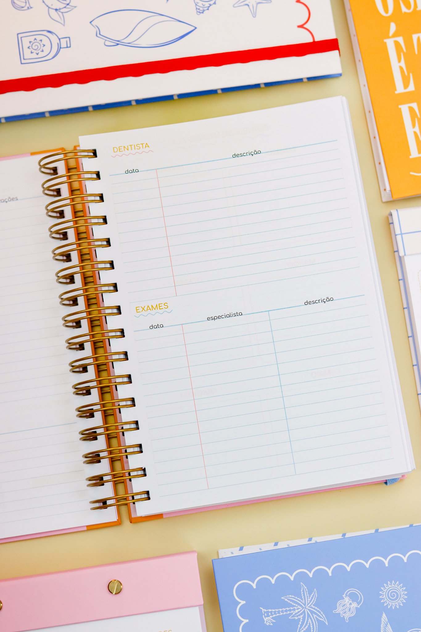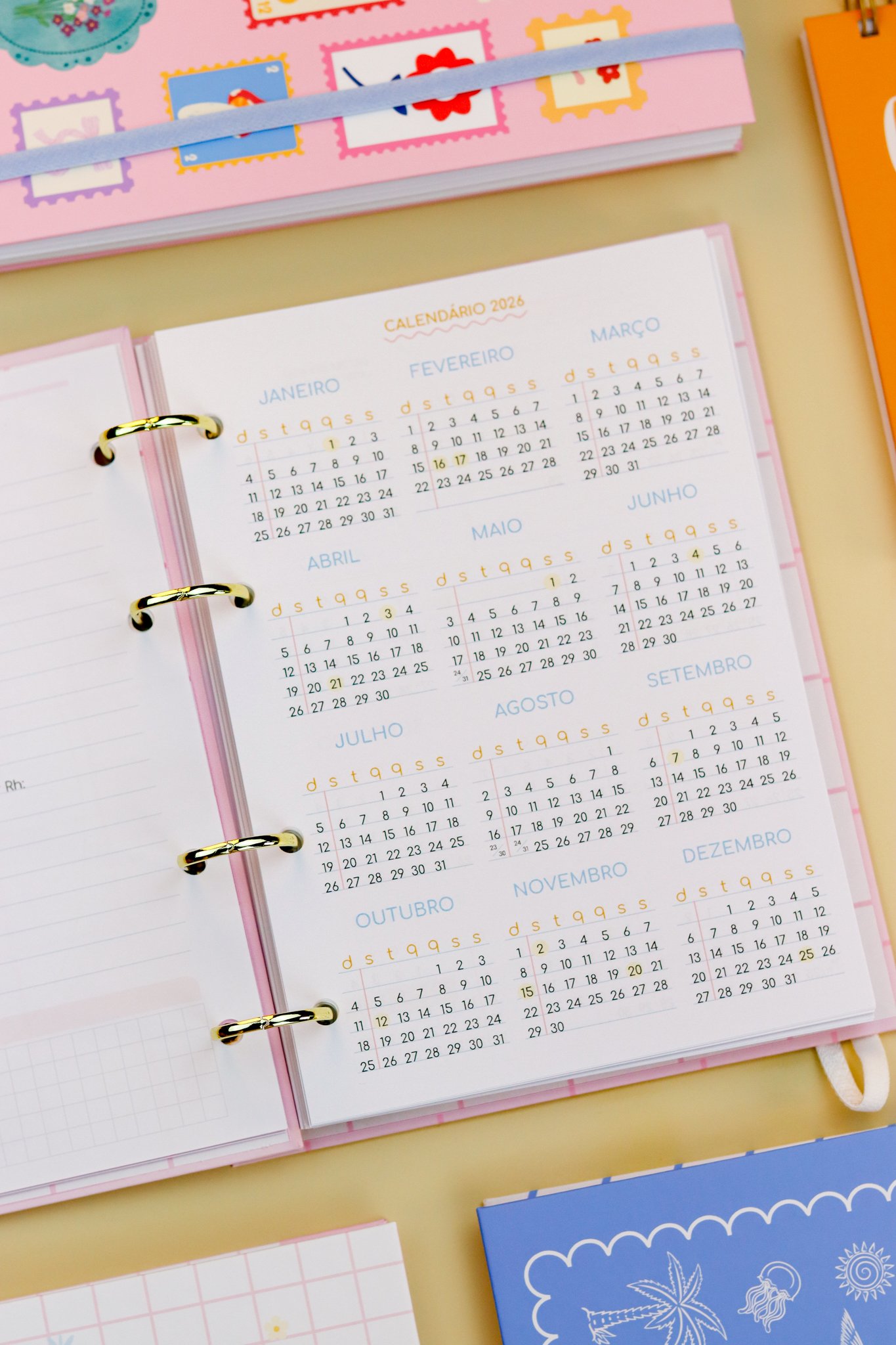 Contéudo das Agendas: Pág de início com frase, pág de dados, calendários 2026/2027 e um insert com 2027/2028, metas para o ano, planejamento do ano de janeiro a dezembro, consultas médicas, planejameno financeiro de janeiro a dezembro, página visão mensal sem datas a cada mês e no verso o resumo do mês.