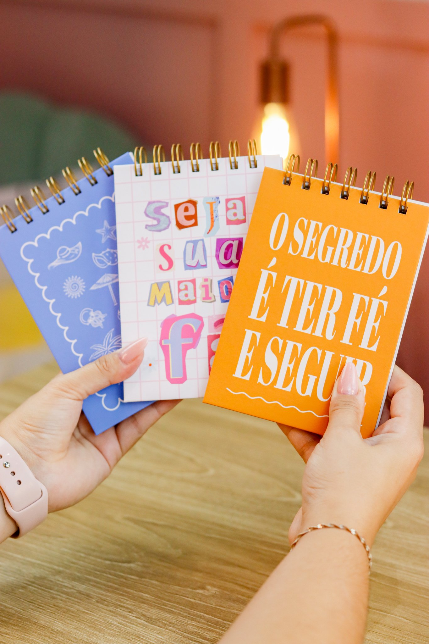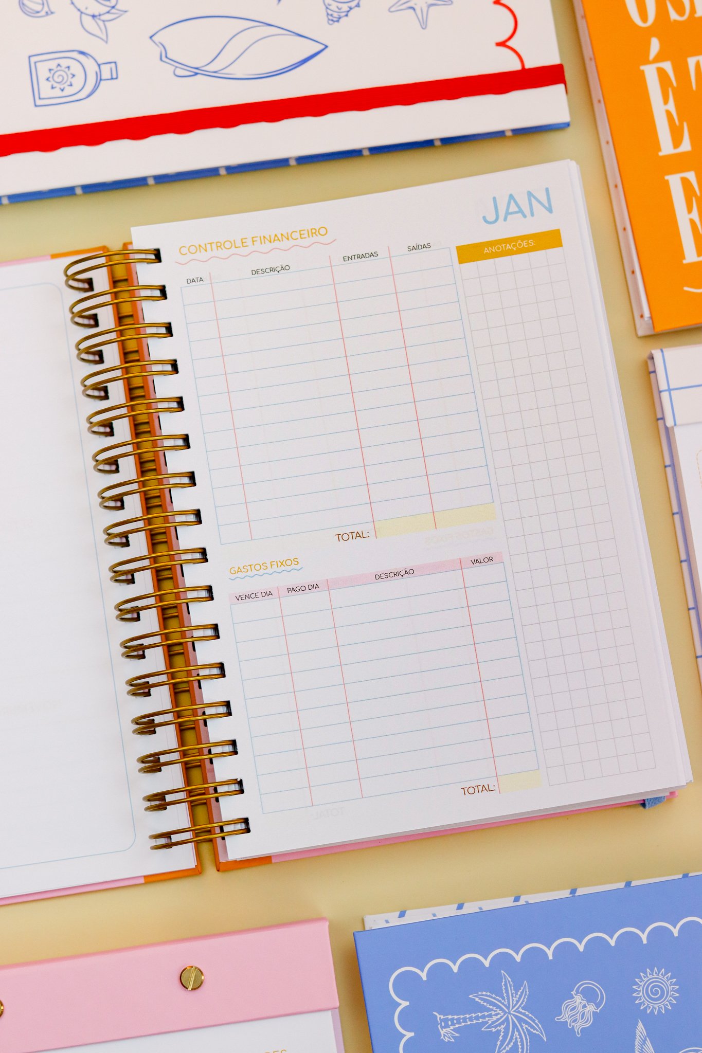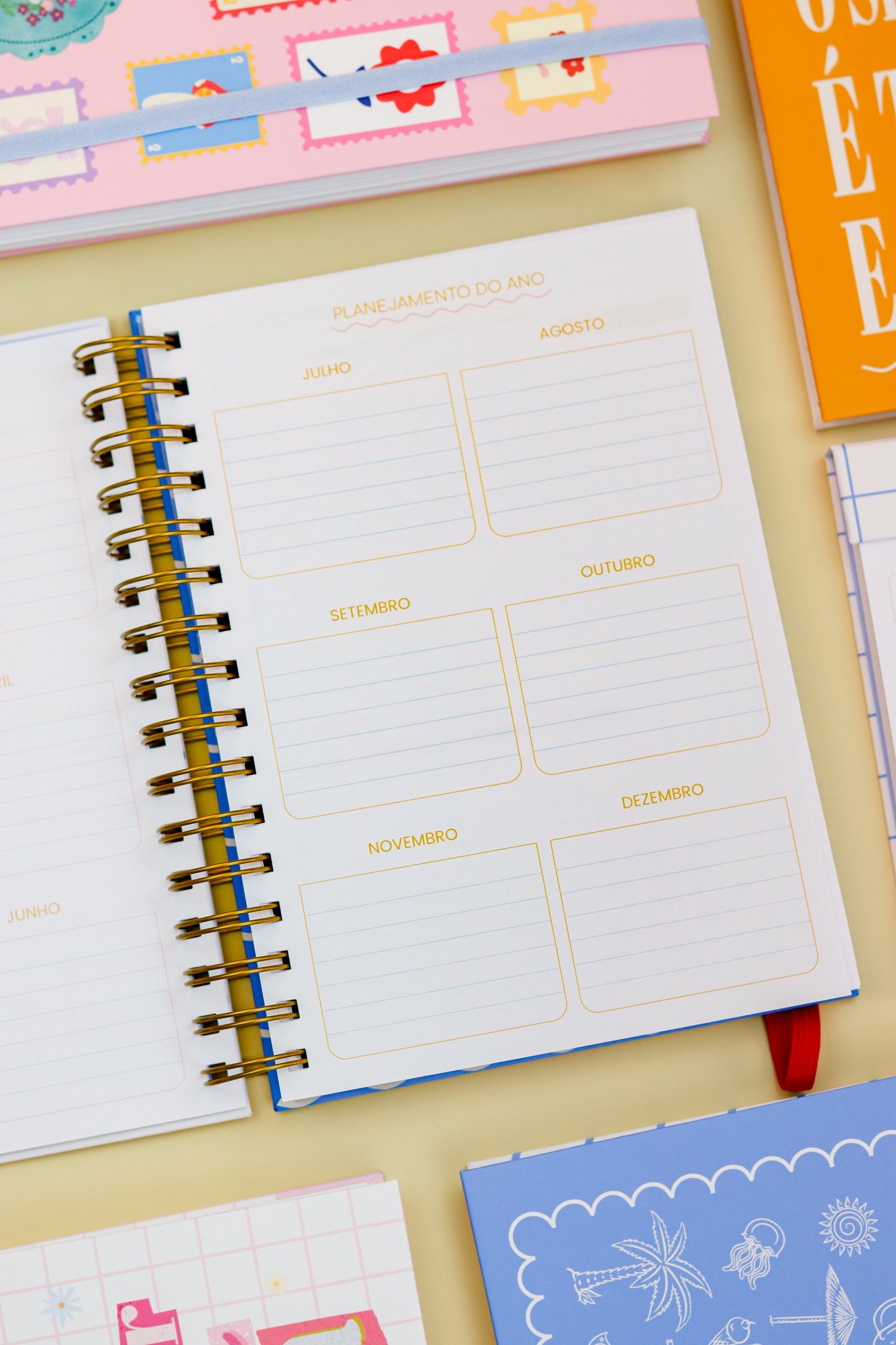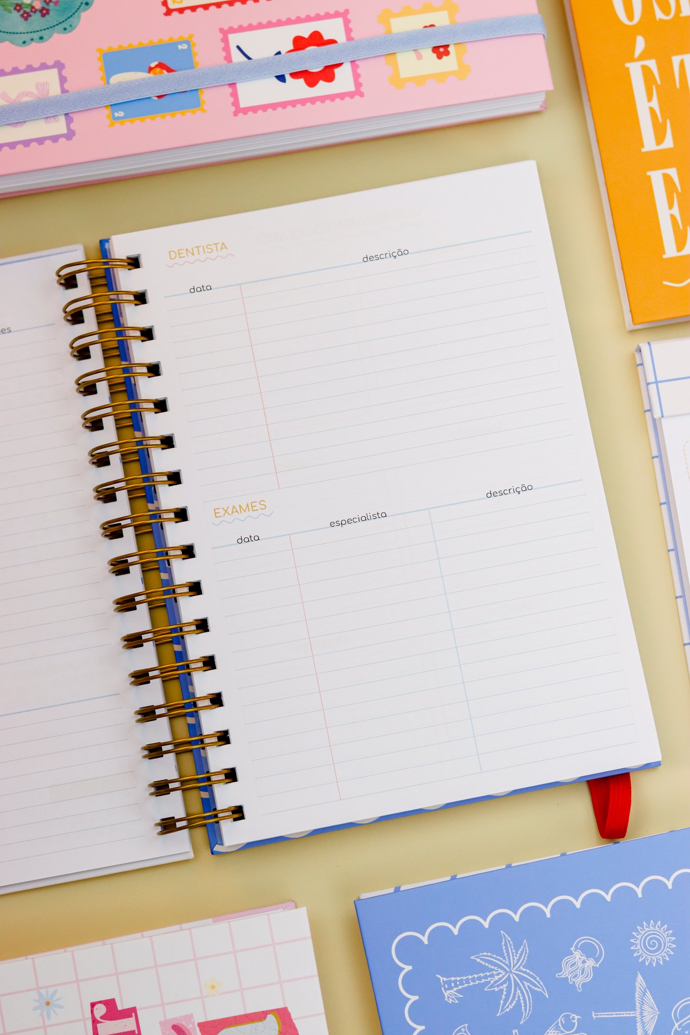 Contéudo das Agendas: Pág de início com frase, pág de dados, calendários 2026/2027 e um insert com 2027/2028, metas para o ano, planejamento do ano de janeiro a dezembro, consultas médicas, planejameno financeiro de janeiro a dezembro, página visão mensal sem datas a cada mês e no verso o resumo do mês.