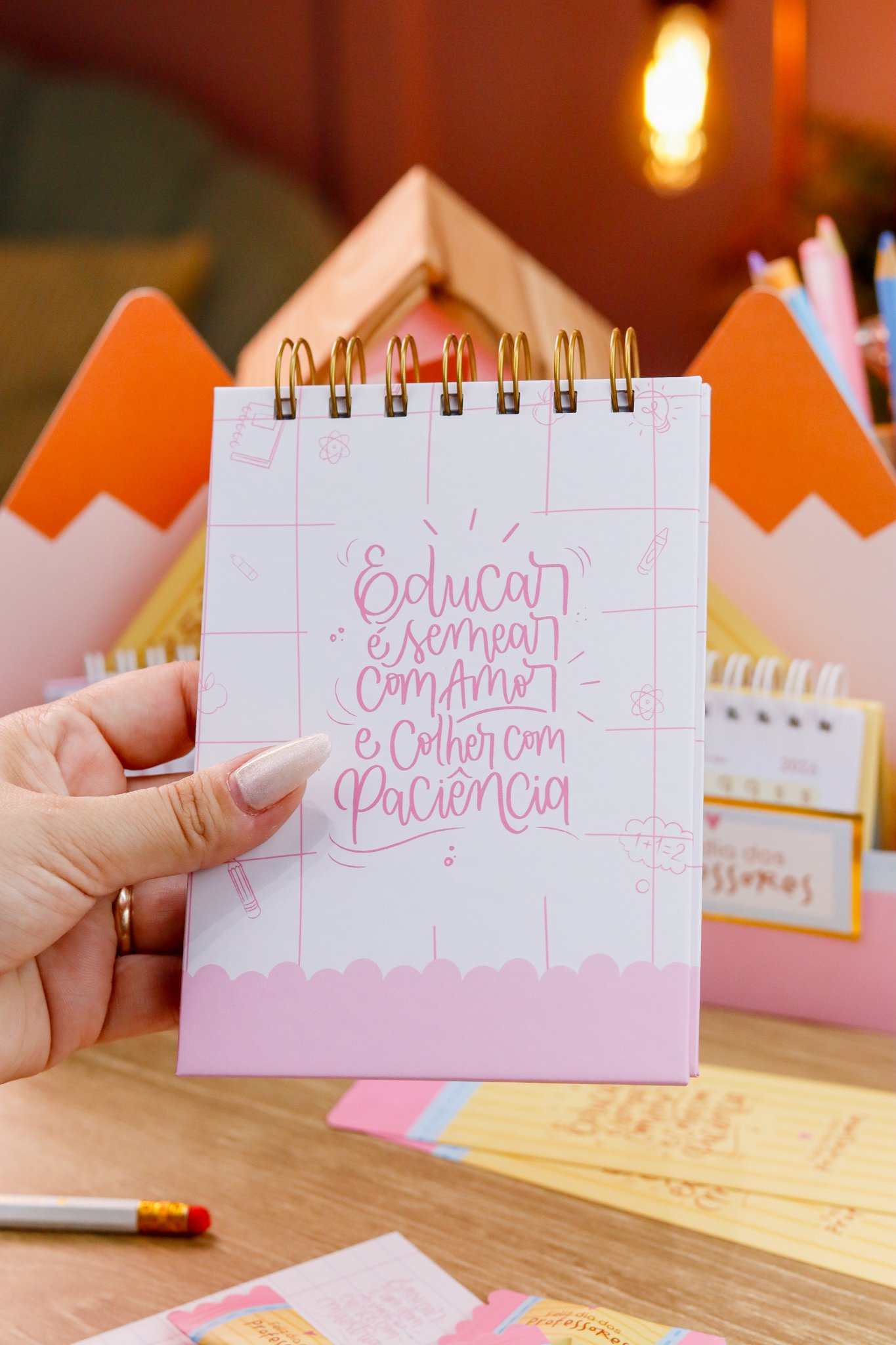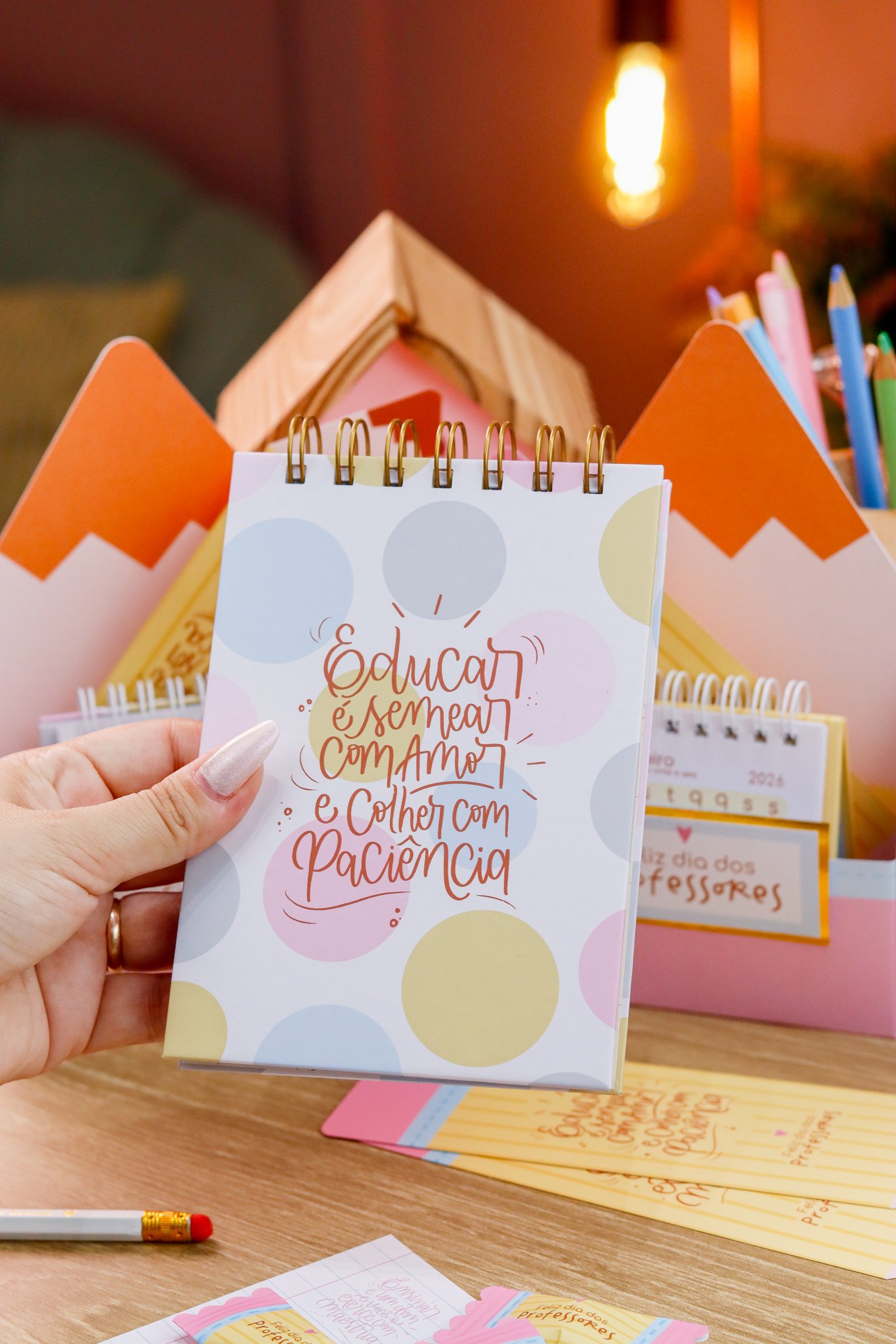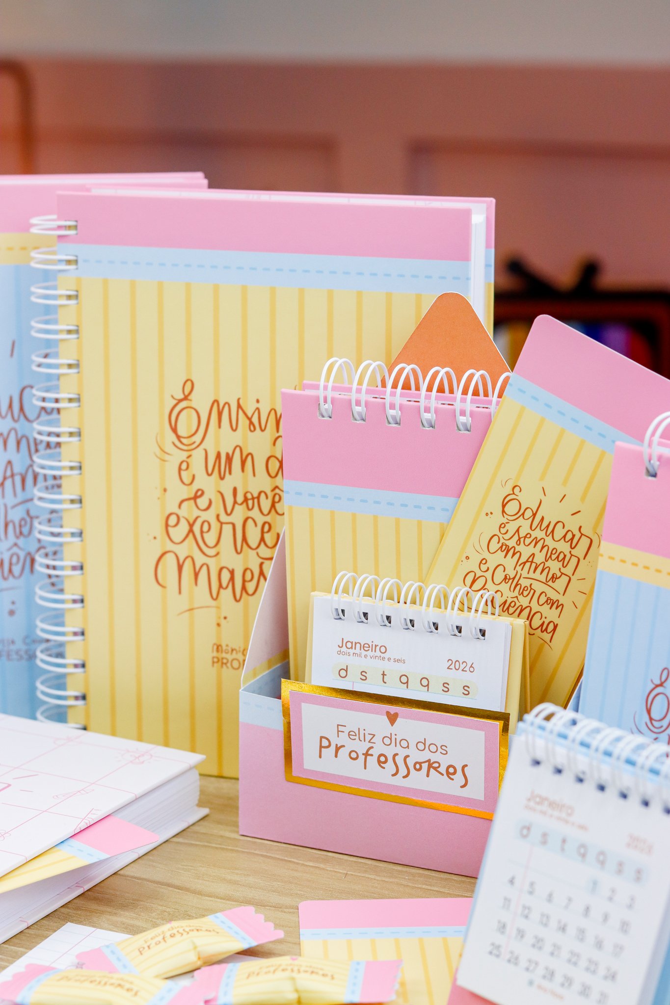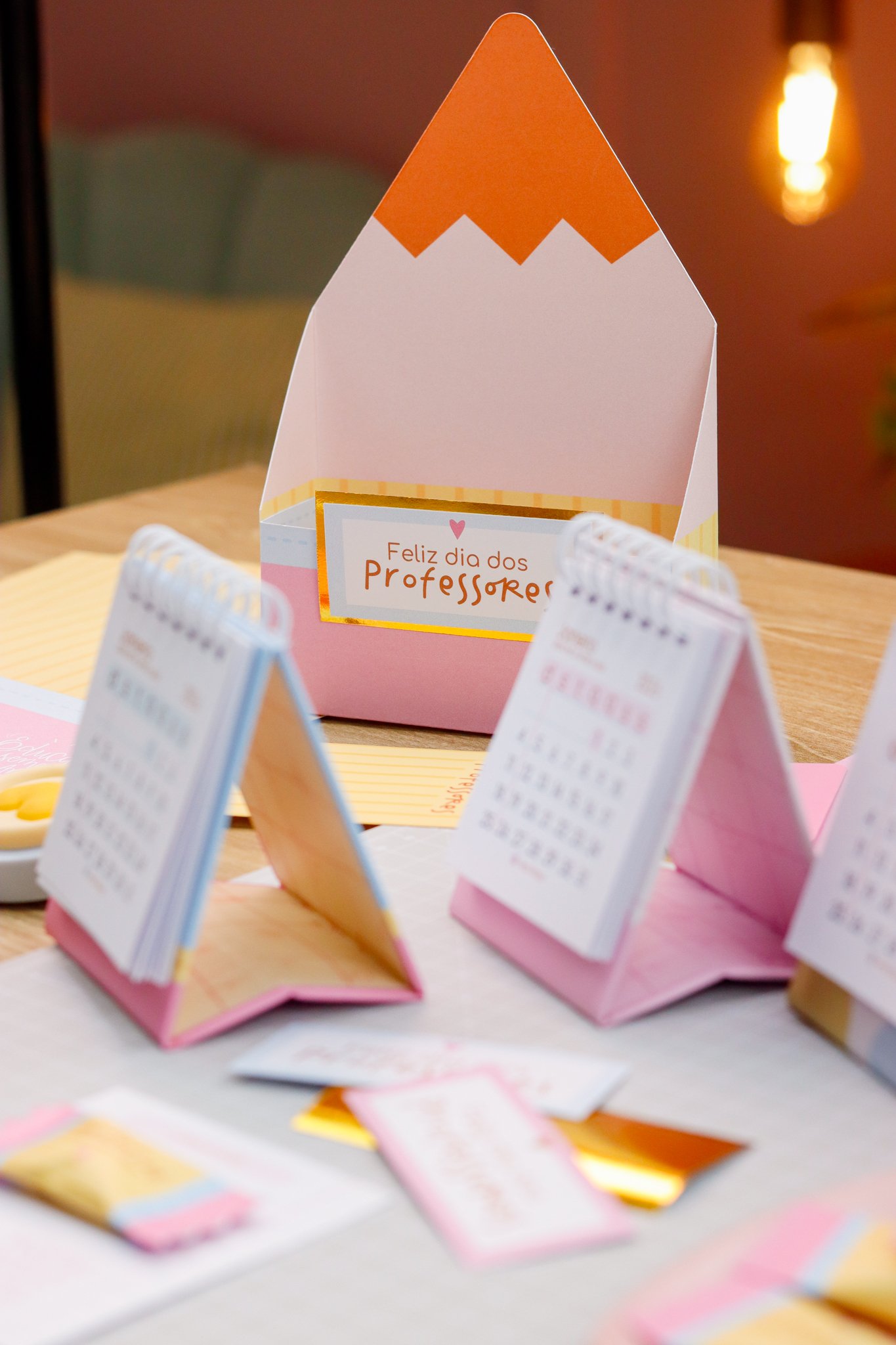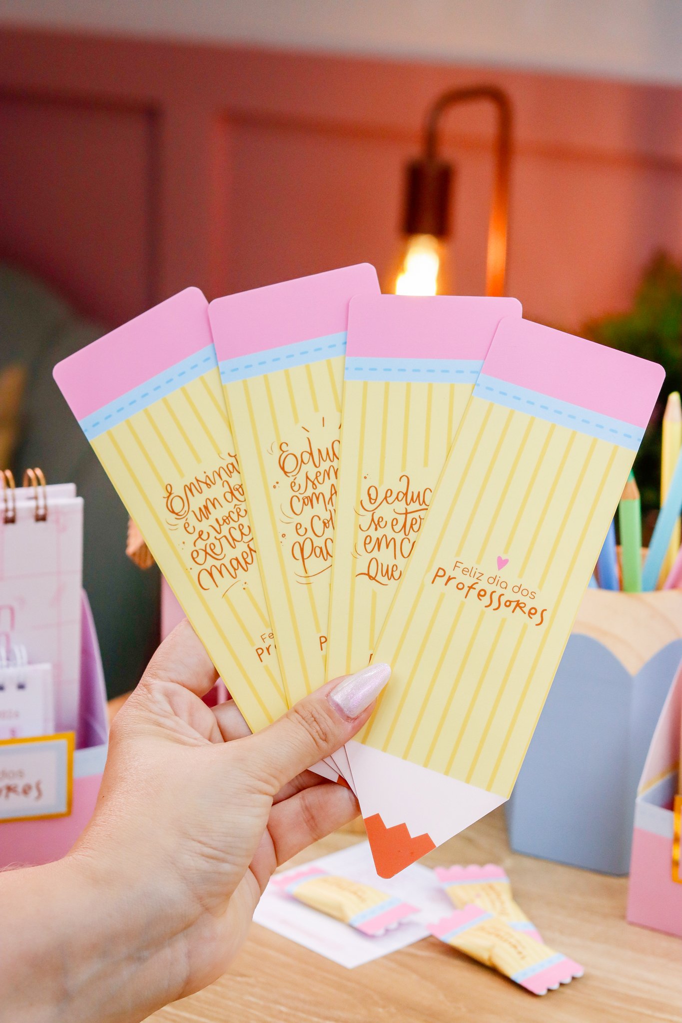5. BRINDE: Mini Kit Professores > Caixa para bloquinho A6 e Mini calendário fofo, arte para balinha e tag, marcadores super fofos com frases em formato de lápis.