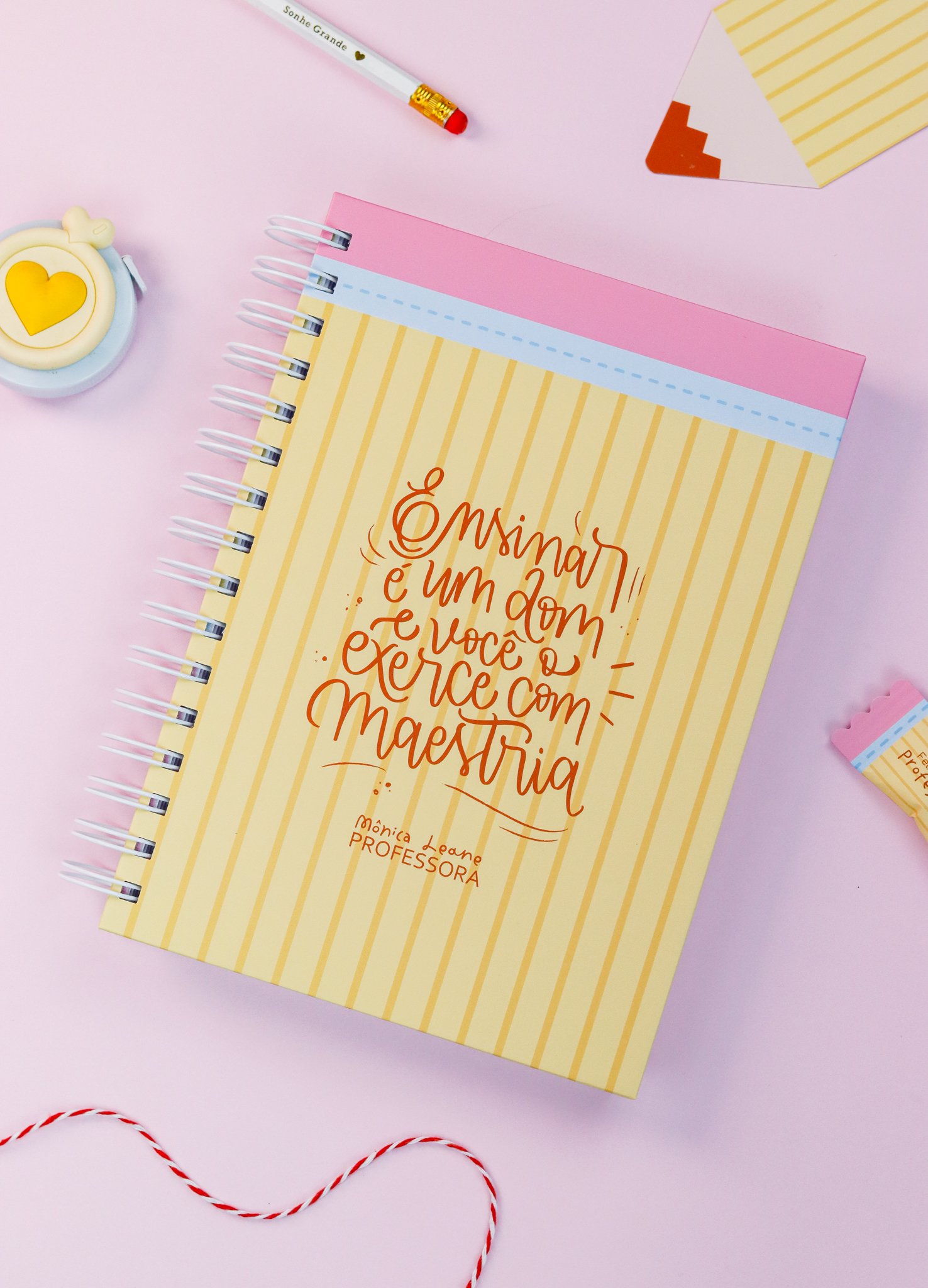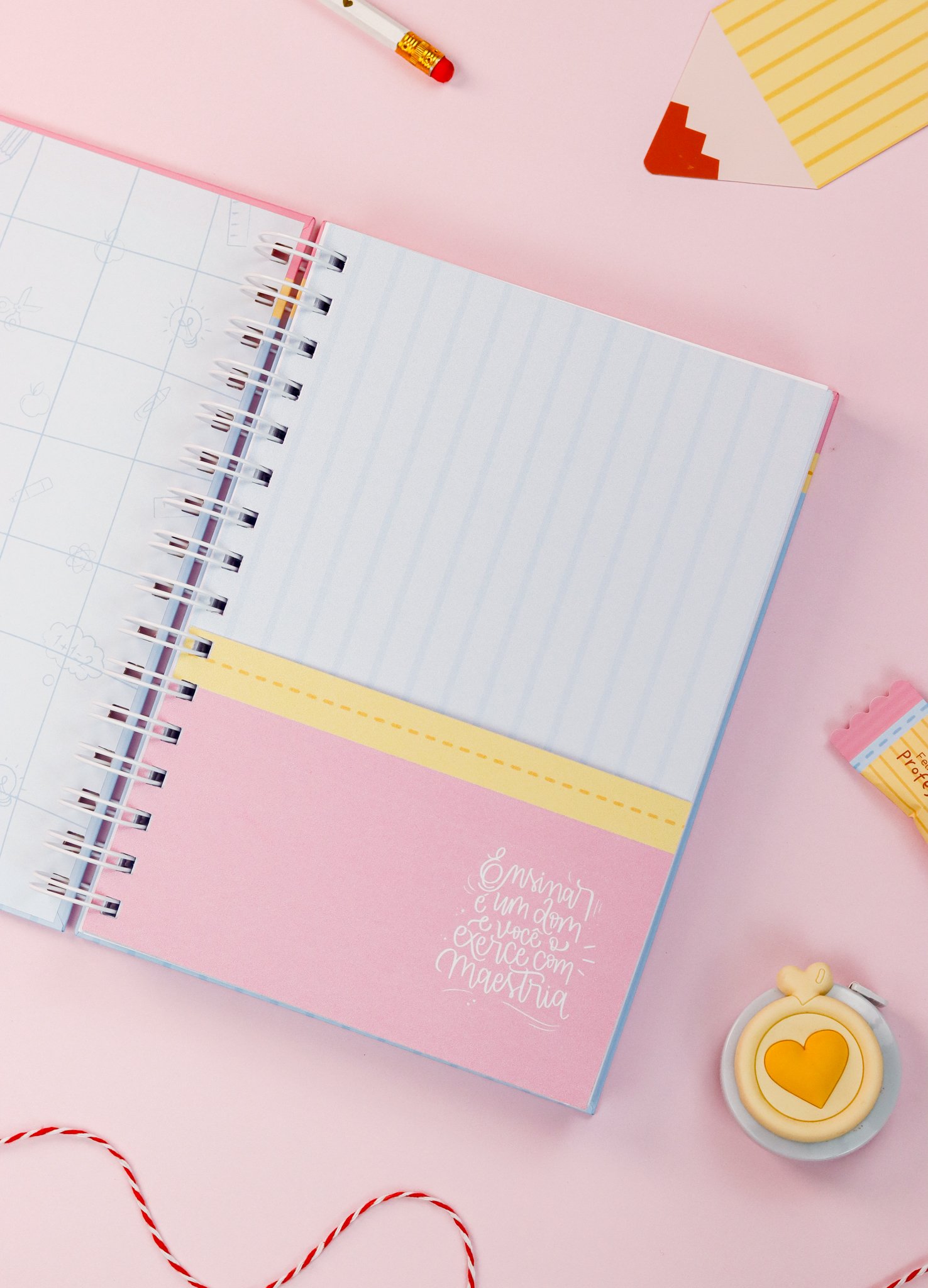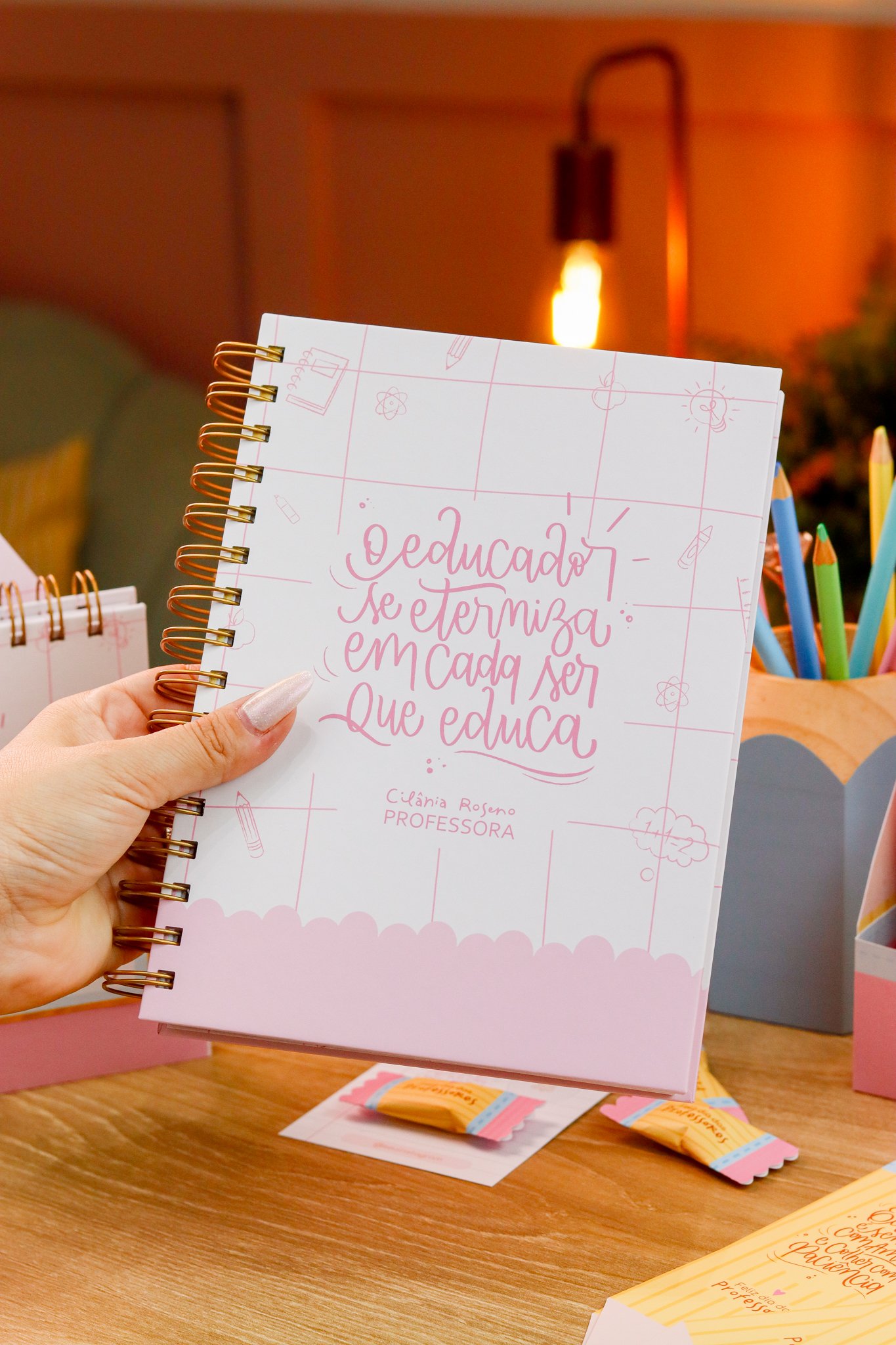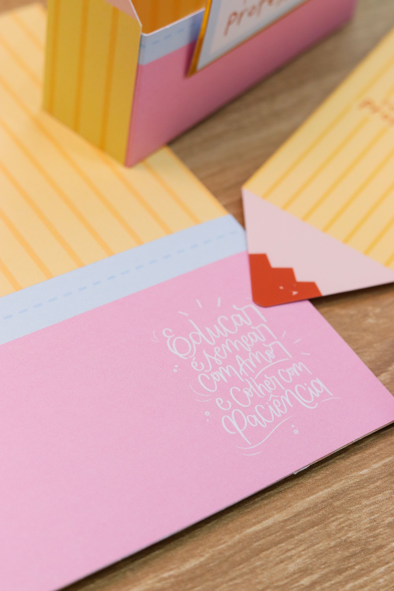 5. BRINDE: Mini Kit Professores > Caixa para bloquinho A6 e Mini calendário fofo, arte para balinha e tag, marcadores super fofos com frases em formato de lápis.