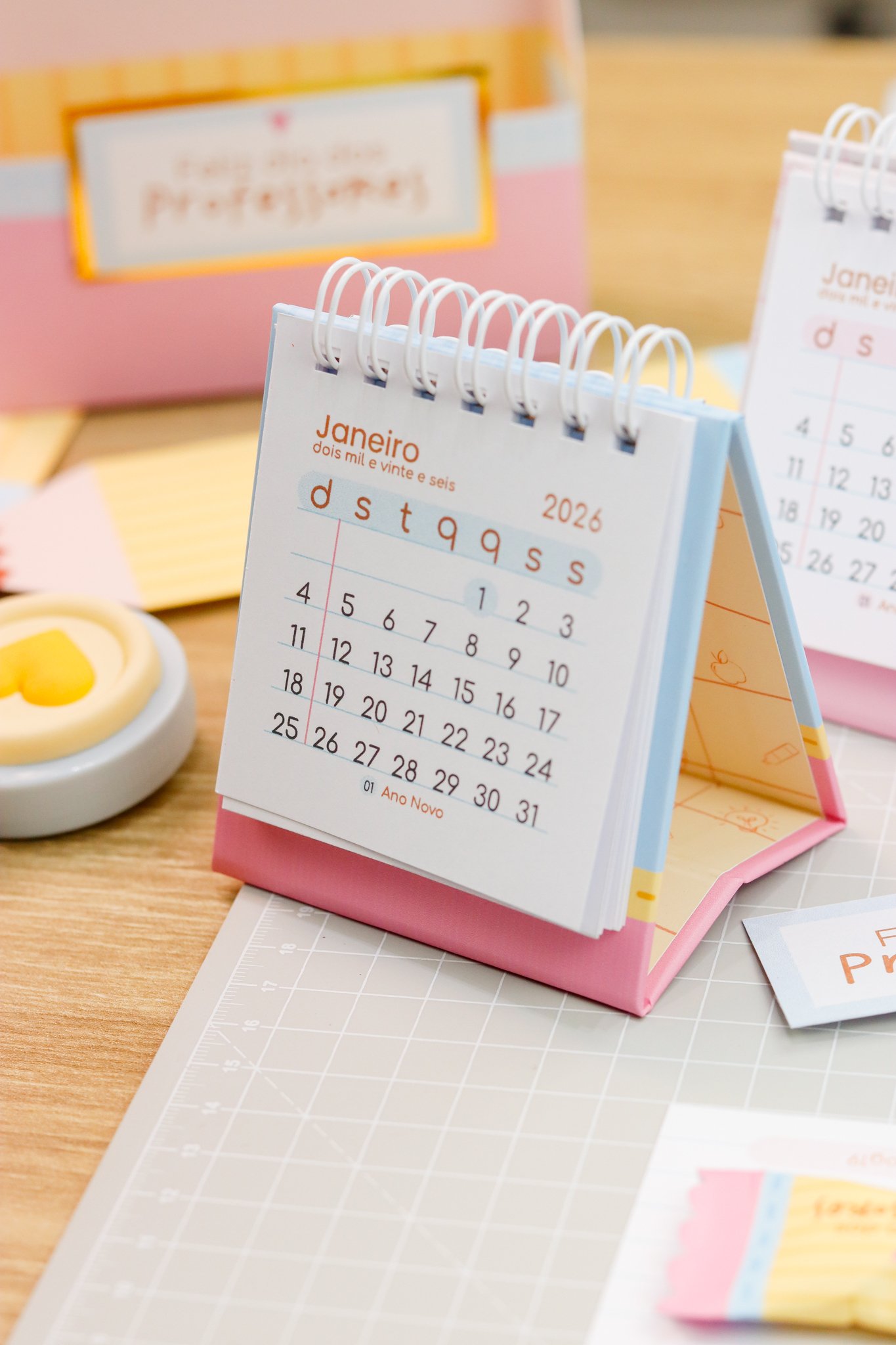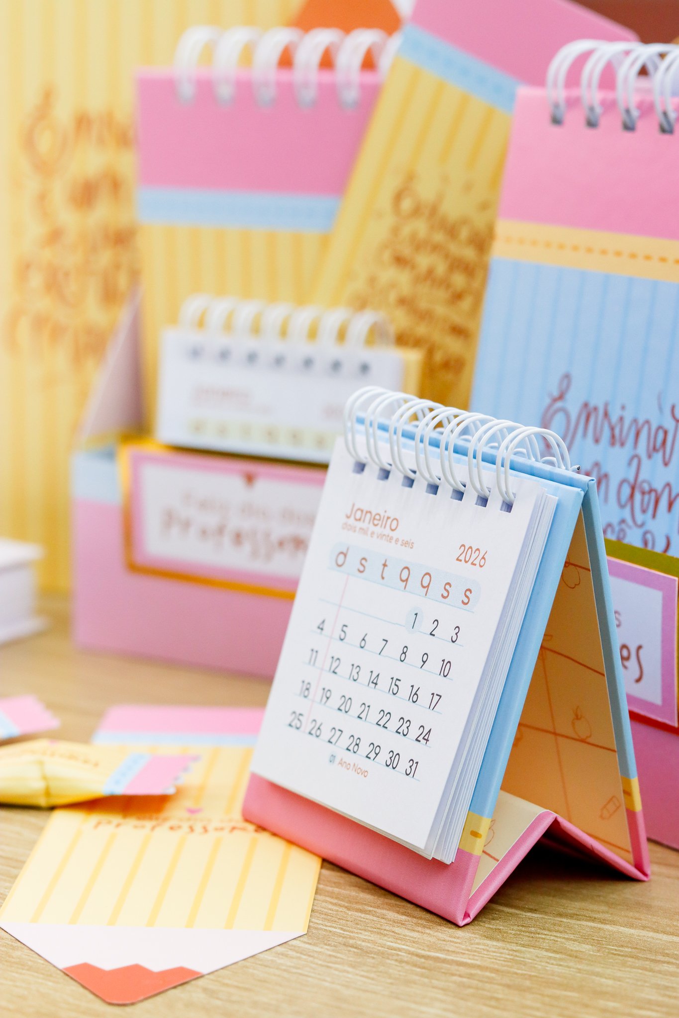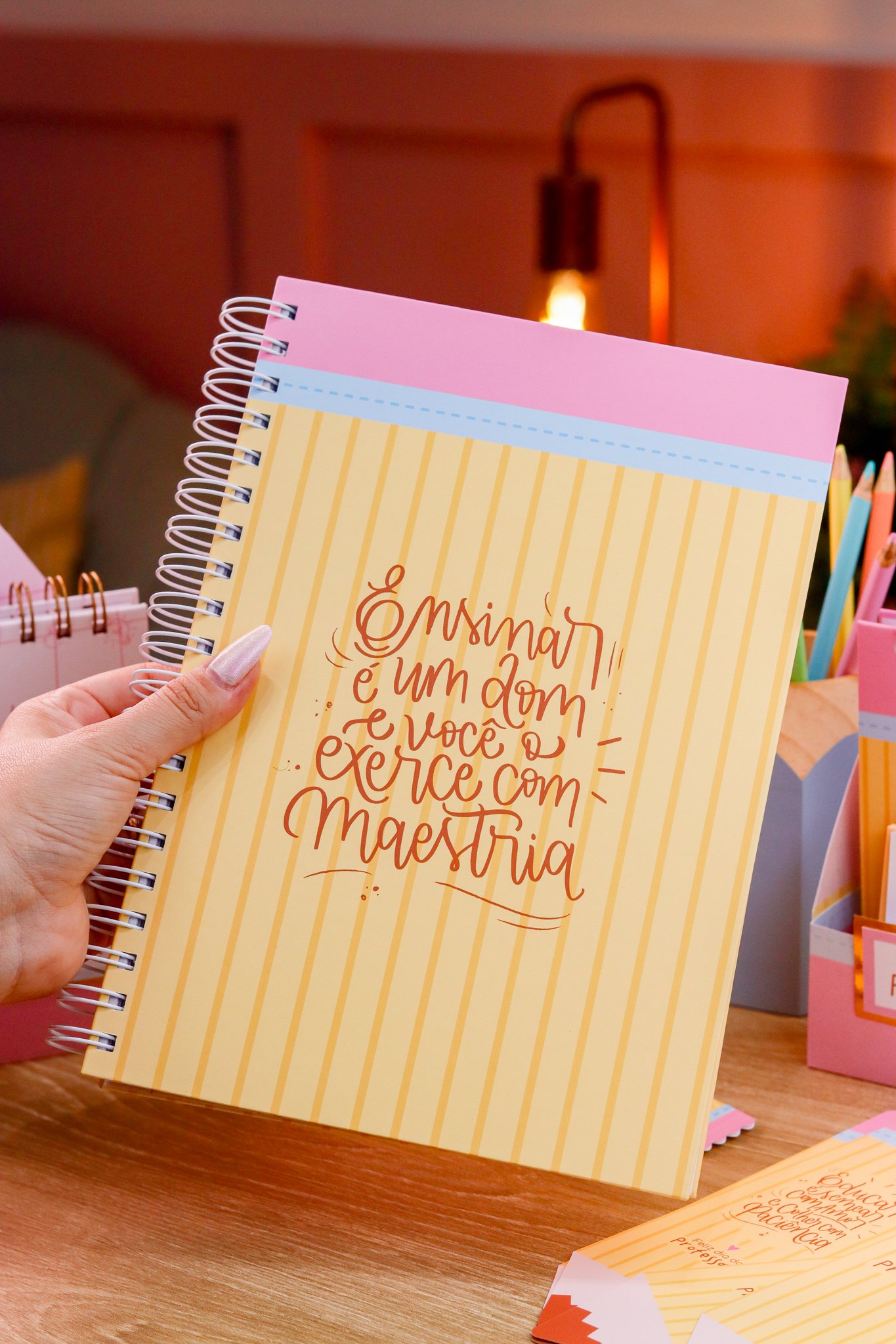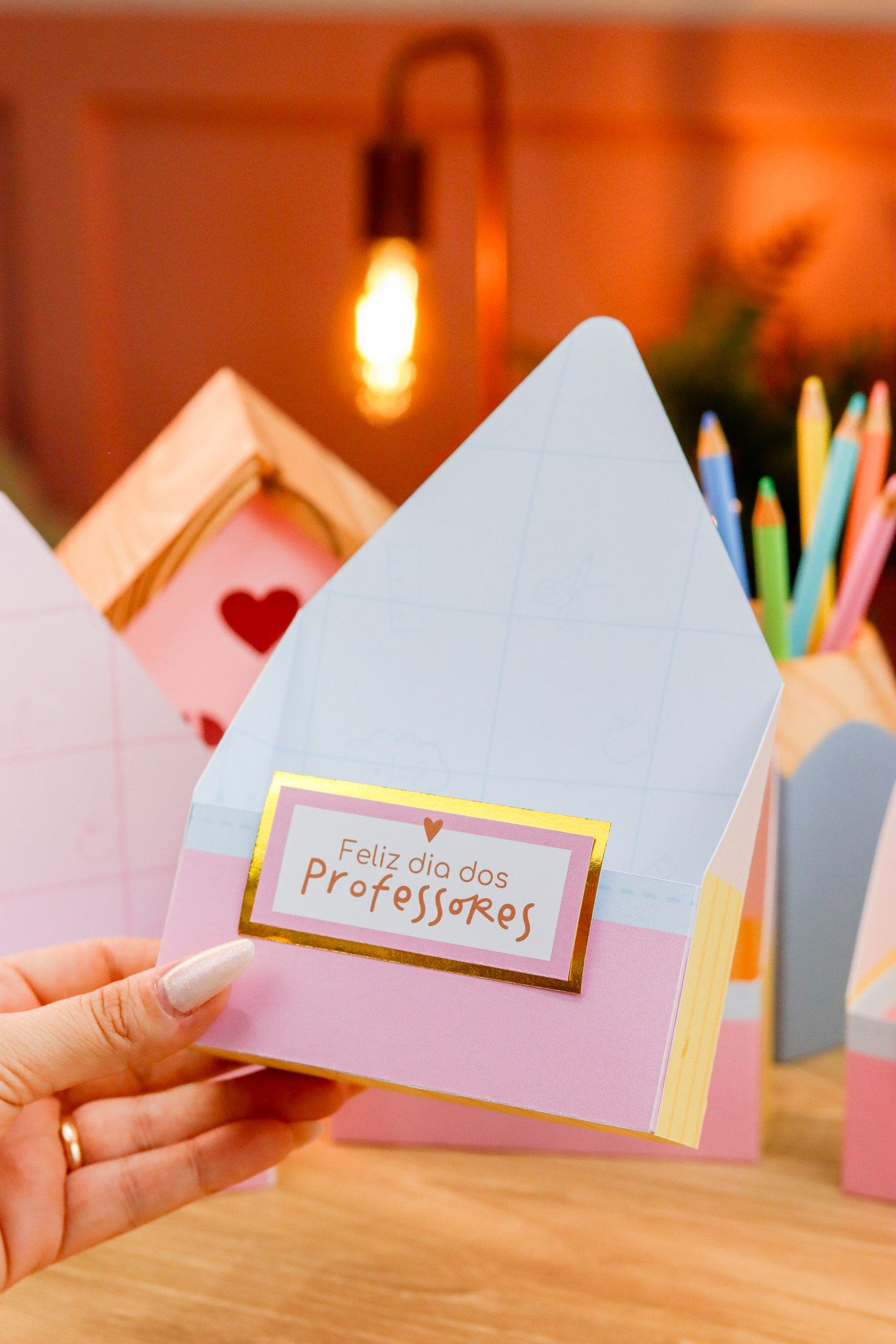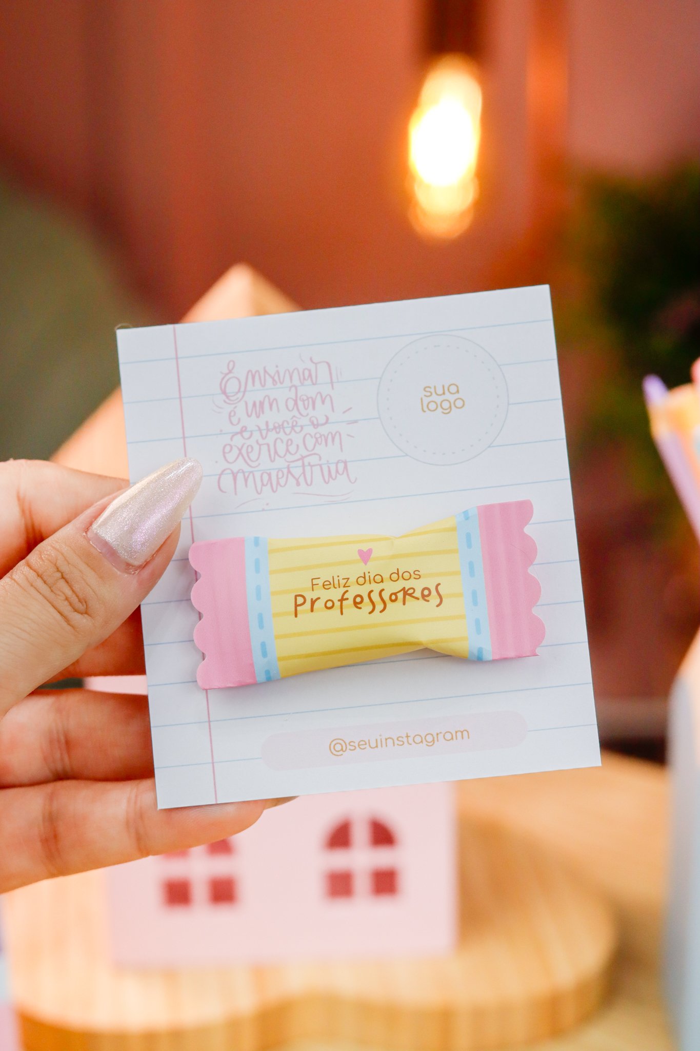 5. BRINDE: Mini Kit Professores > Caixa para bloquinho A6 e Mini calendário fofo, arte para balinha e tag, marcadores super fofos com frases em formato de lápis.