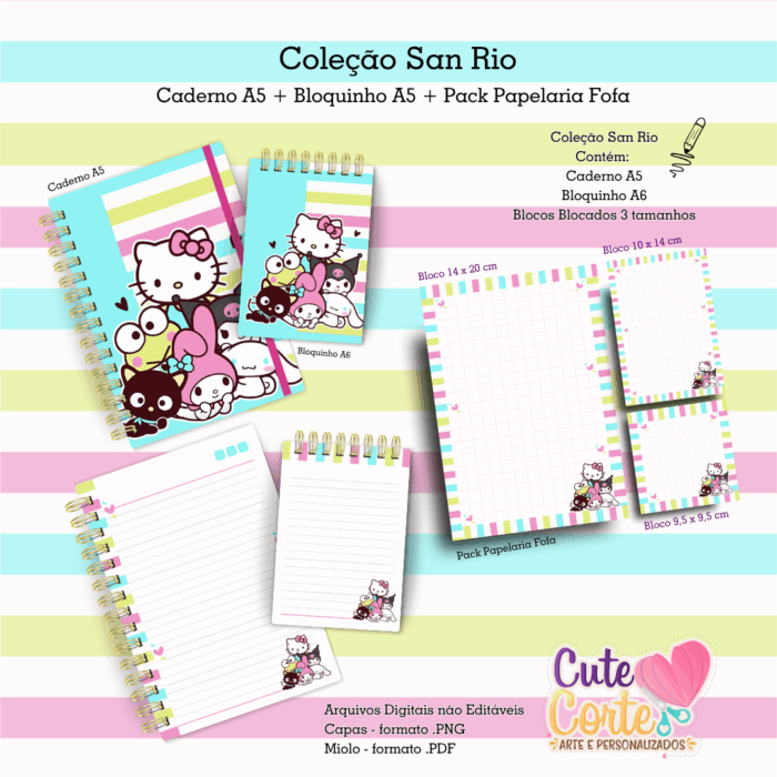 Coleção San Rio – Caderno A5 _ Bloquinho A6 + Pack Papelaria Fofa