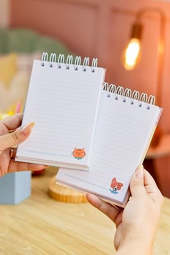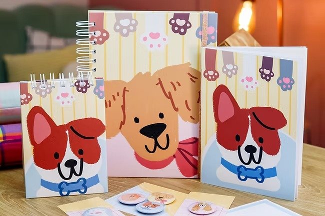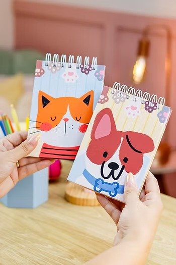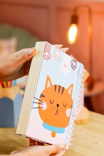 - Cadernos escolares, com matéria e folha decorativa em dois tamanhos: A5 e o tamanho colegial.