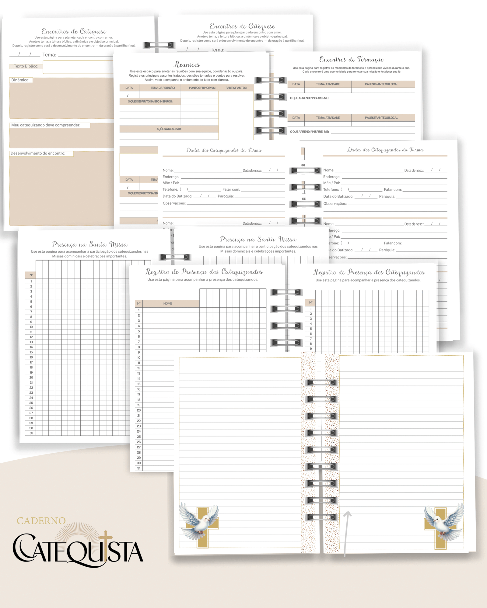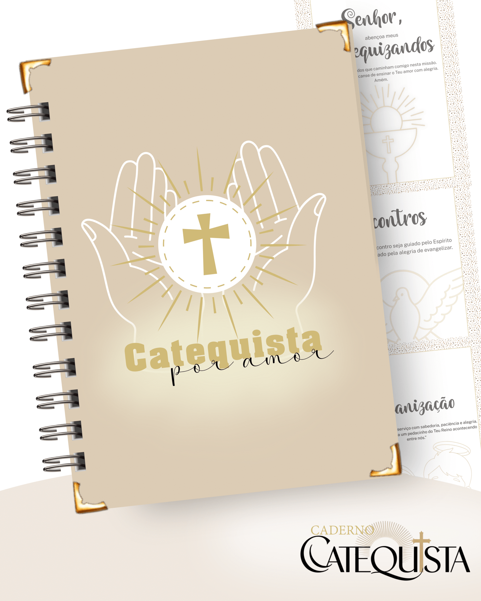 O caderno é composto por diversas seções fundamentais para a formação cristã: