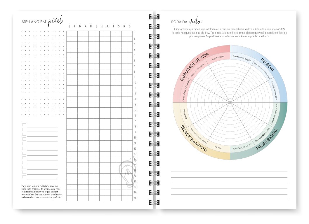 - Miolo com cores diversas – Meses com cores intercaladas (Rosa, Salmão, Azul, Azul esverdeado, Pistache e Verde)