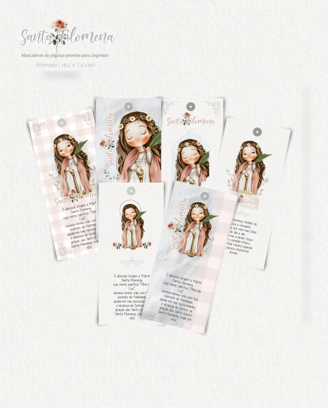 6 cards A6 16x 7,4 cm (3 por folha A4)) com ilustrações de Santa Filomena e orações em JPG e PDF pronta para imprimir