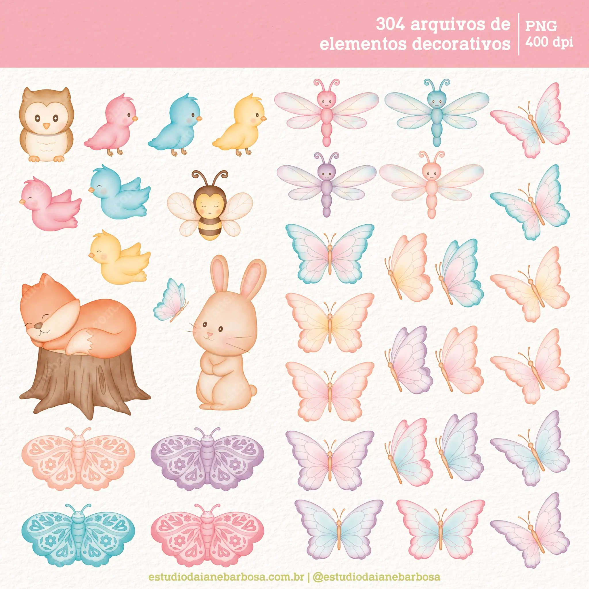 – 37 arquivos de animaizinhos, como passarinhos, borboletas, libélulas, mariposas e muito mais!