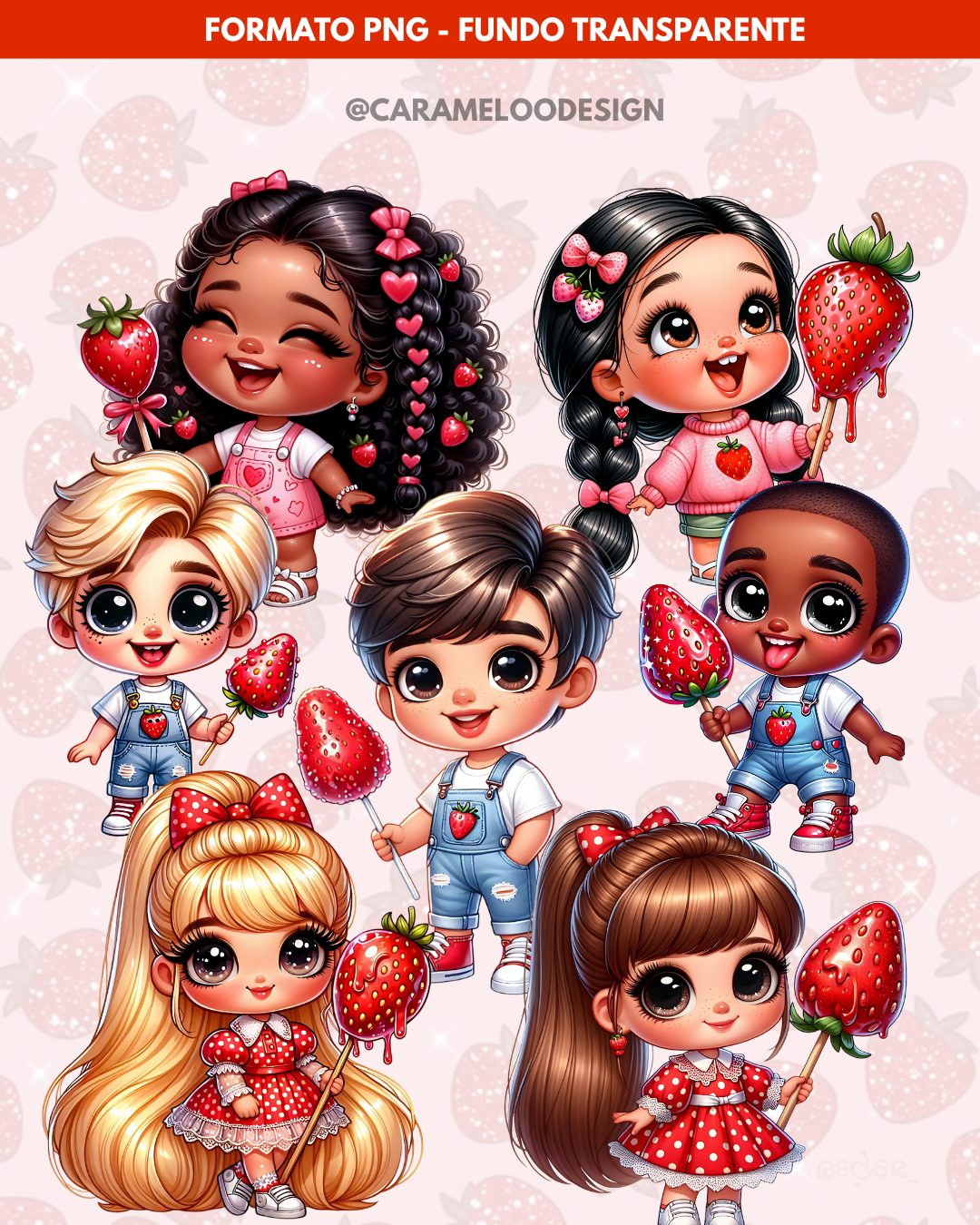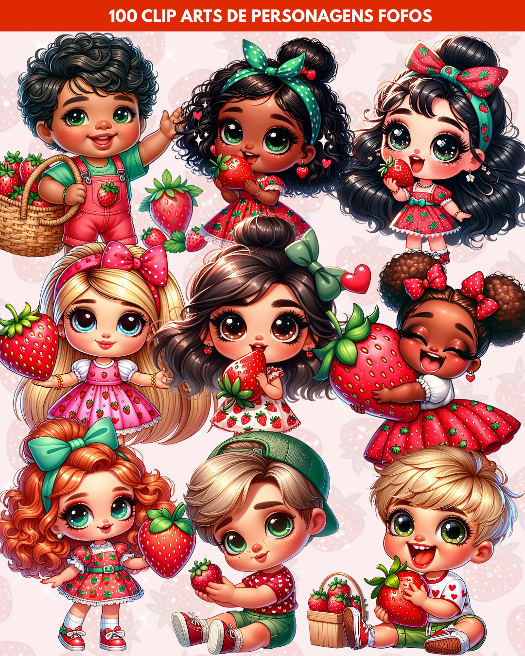 100 ilustrações de personagens interagindo com morangos, em PNG com fundo transparente