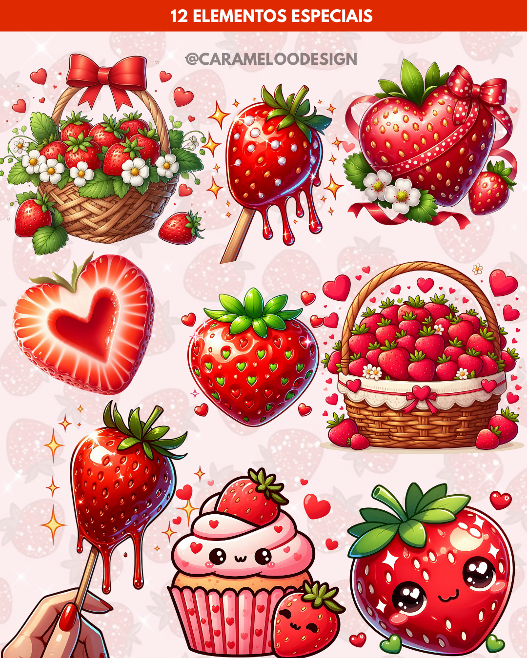 12 elementos temáticos como cestinhas, morangos e corações